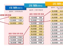 우선, 지난 2차에 걸친 요금제 개편을 통해 데이터 중간 구간(20~100GB)을 대폭 신설(4~5개 구간)한 바 있다. 더불어 이번 3차 개편으로 5G 3만원대 구간 신설과 함께 5~20GB 구간도 세분화하여, 기존에 4만원대 중후반이었던 5G 요금 최저구간을 최대 1만원 낮추는 등 이용자의 부담을 대폭 경감할 수 있게 됐다.