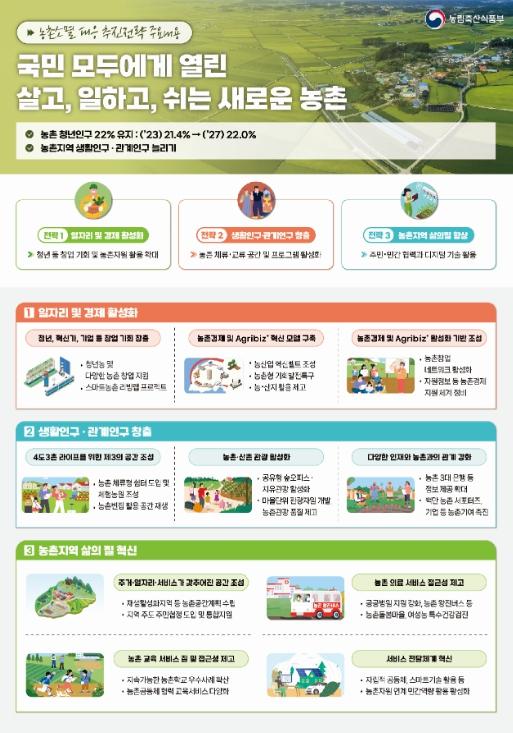 새로운 농촌 패러다임은 농업인·청년·혁신가·기업가 등이 모이는 ‘창의적 공간’, 첨단기술 적용 등으로 농촌의 잠재력을 극대화하는 ‘스마트 공간’, 집적화되고 기능적으로 연계된 ‘네트워크 공간’ 등으로 농촌 공간의 가치와 기능을 전환하기 위해 ①일자리·경제 활성화, ②생활인구·관계인구 창출, ③ 농촌 삶의 질 혁신 등 3대 전략을 통해 구체화하였으며, 농촌공간계획, 소멸위험지수 등 관련 제도 및 인프라 확충도 추진한다.