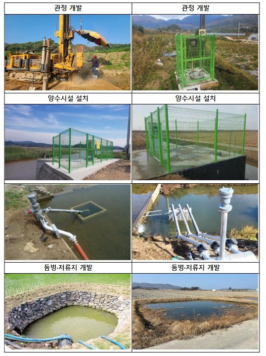 농식품부는 이러한 물 공급 사각지역을 해소하기 위해 10개 시·도로부터 물 부족 지역 현황과 용수개발 계획을 제출받아 물 수요·공급 분석과 용수개발 계획의 적정성 등에 대한 검토를 거쳐 56개 시·군에 관정과 둠벙 71개소 개발, 양수시설 13개소 설치, 저류지 11개소 준설·확장·신설 등을 지원하기로 한 것이다.