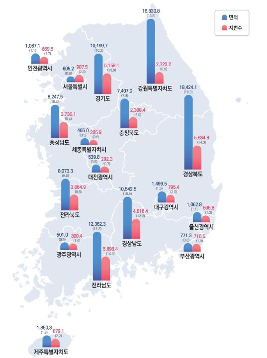 전국의 토지와 임야대장에 등록된 국토 면적은 100,449.4㎢(39,632천 필지)로 전년 대비 5.8㎢ 증가했다.