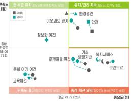 도시와 농어촌의 생활 부문별 중요도와 만족도를 통한 아이피에이(IPA) 분석 결과, 2018년과 2023년 모두 농어촌의 보건의료, 복지서비스, 기초 생활 기반, 경제활동 여건이 중요도와 비교해 만족도가 낮아 개선이 필요한 것으로 나타났다.