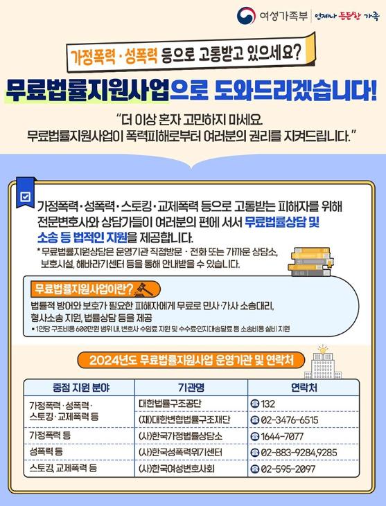 법률적 방어와 보호가 필요한 피해자에게 무료로 민사·가사 소송대리, 형사소송 지원, 법률상담 등을 제공