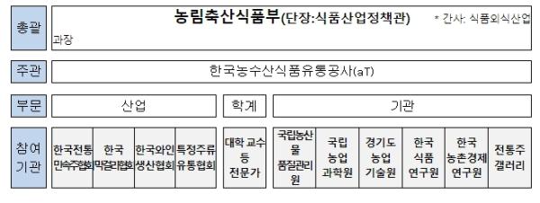협의체는 농식품부가 총괄·조정, 한국농수산식품유통공사가 주관하고, 산업계, 학계, 관계기관의 3개 부문으로 구성하여, 전통주 산업 동향 공유 등 소통을 활성화하고, 개선 과제를 도출해 해결 방안을 토의할 예정이다.