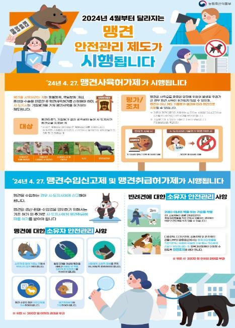 첫째, 맹견을 사육하려는 사람은 일정 요건을 갖추고, 기질평가를 거쳐 시·도지사에게 허가를 받도록 하는‘맹견사육허가제’가 도입·시행된다.