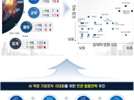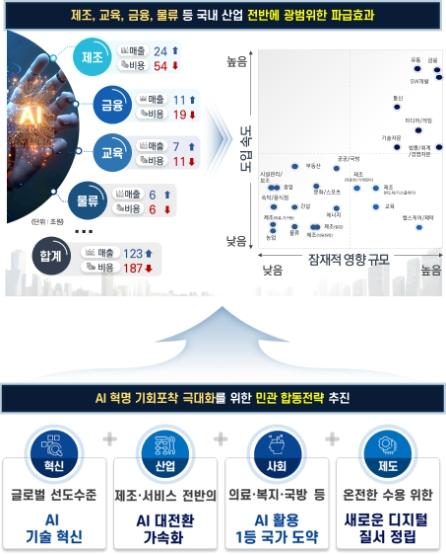경제효과는 AI 융합 신제품 출시 등을 통한 연간 매출 증대 123조원, 효율화 및 자동화 등을 통한 연간 비용절감 185조원 등이며, 분야별로 서비스업 136조원(총 효과의 44.4%), 제조업 77조원(총 효과의 25.2%), ICT 산업 24조원(총 효과의 7.8%) 등으로 구성된다. 분석 결과는 AI 도입에 따른 매출 증대 효과가 GDP 증대로 연결될 경우 연 평균 1.8%p 수준의 추가 경제성장 효과를 누릴 수 있다는 의미로도 풀이된다.