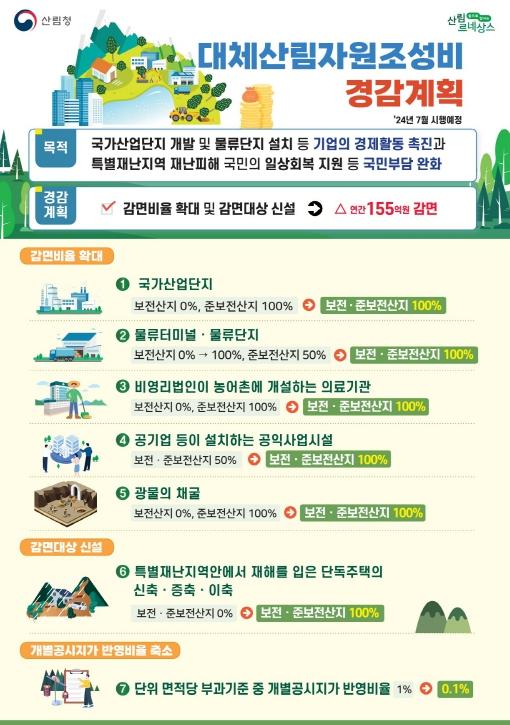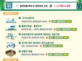 감면비율 및 면제대상 확대에 따라 연간 약 155억 원 가량의 대체산림자원조성비가 감면될 것으로 예측하고 있다.