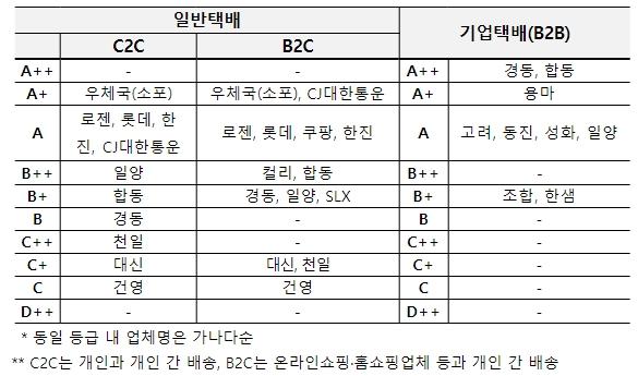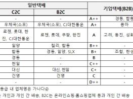 B2C(기업 → 개인) 부문에서는 ‘우체국(소포)’과 ‘CJ대한통운’이 가장 높은 등급(A+)을 받았다. ‘쿠팡CLS’ 등 4개 업체가 다음으로 높은 등급(A)을 받았다.