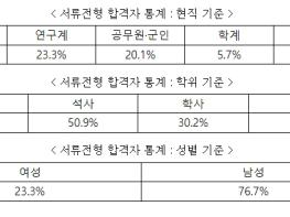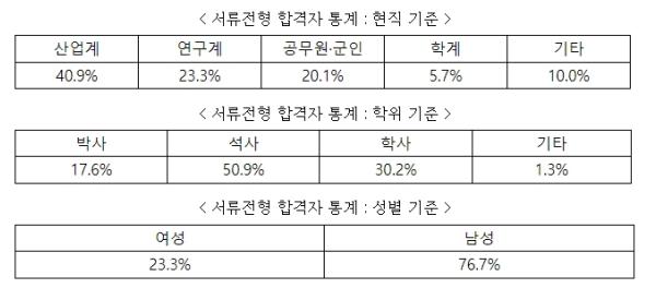 서류전형 합격자 통계를 살펴보면 산업계 40.9%, 연구계 23.3%, 공무원?군인 20.1%, 학계 5.7%, 기타 10.0%를 차지하며, 학위별로는 박사 17.6%, 석사 50.9%, 학사 30.2%, 기타 1.3% 비중을 차지하였다. 성별은 여성이 23.3%, 남성이 76.7%다.