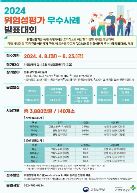 [한국쇼핑몰뉴스, 최영진기자] 고용노동부와 안전보건공단(이사장 안종주)은 오는 8일부터 8월 23일까지 위험성평가 우수사례를 공모한다. 위험성평가란 노사가 함께 사업장의 유해위험요인을 찾고 개선하는 과정으로 가장 효과적인 산재예방 활동이다. 우수사례를 제출한 기업은 10월 지역 예선을 거쳐 11월 본선인 ?위험성평가 우수사례 발표대회?에 출전하게 된다.