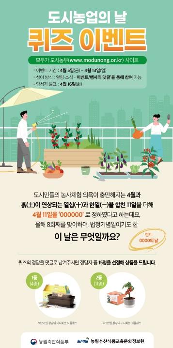 농식품부는 전국 도시농업의 날 행사에 참여하는 시민들에게 일상 생활에서도 반려식물을 쉽게 기를 수 있도록 반려식물 체험키트(600개)를 나눠주고, 도시농업 포털 서비스 ‘모두가 도시농부’에서는 퀴즈 이벤트와 함께 텃밭 식재작물 추천, 관리요령 등의 내용을 담은 ‘나만의 텃밭만들기’ 정보도 제공할 계획이다.