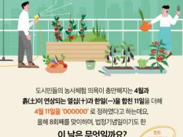 도시농업의 날은 2017년부터는 법정기념일로 지정되어 올해 8회째를 맞이한다. 만물이 소생하는 봄, 도시민의 농사 의욕이 충만해지는 4월과 흙이 연상되는 11일(十 +一 = 土)을 합쳐 4월 11일을 도시농업의 날로 정했다.