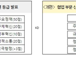 - 아울러, 그간 해결이 어려웠던 덩어리 규제, 갈등 규제 등 다수 부처 및 다양한 이해관계가 대립하는 복합규제 개선을 독려하기 위해 기관간 협업정도를 반영하는 ‘규제혁신 부처간 협업’ 지표를 신설(비중 5%)했다.