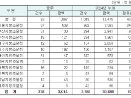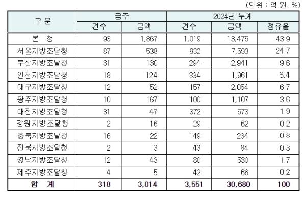 지역별 발주량을 보면 대전광역시 소재 본청 1,867억 원, 서울지방청 538억 원 등 2개청(2,405억 원)이 전체 금액(3,014억 원)의 79.8%를 차지하고 있으며, 인천 등 나머지 10개 지방청 609억 원이 각각 집행될 예정이다.