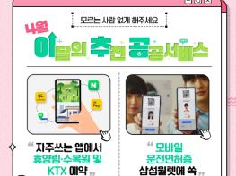 KTX·SRT 승차권 예매를 비롯해 봄철 이용량이 급증하는 국립수목원·자연휴양림 예약 등을 네이버, 카카오톡, 금융앱(토스·신한플레이·KB페이) 등 평소 자주 사용하는 민간앱에서도 편리하게 이용할 수 있다.