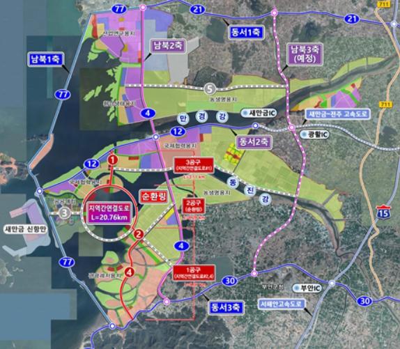 새만금 지역간 연결도로는 3개 공구(총연장 20.76km)로 나눠 추진하며 총사업비는 1조 1,287억원 규모다. 공구별로는 1공구(9.37km) 3,149억 원, 2공구(8.28km) 6,363억 원, 3공구(3.11km) 1,437억 원이다. '그림 별첨'