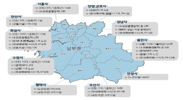 수도권 남부지역은 2기 신도시 등 다수 개발사업이 진행됨에 따른 인구집중으로 여러 도시(수원?용인?화성 등) 인구가 100만명에 육박하는 등 4개 권역 중 서울로 통행량이 가장 높은 권역이다.