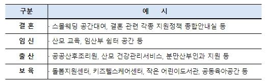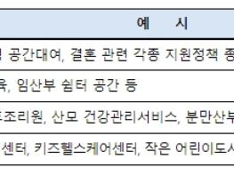 선정된 지자체는 지역의 수요와 시설현황 등을 종합적으로 반영하여 스몰웨딩 공간대여, 산모교육, 공공산후조리원, 키즈헬스케어센터 등을 자유롭게 조합, 통합지원센터를 조성할 수 있다.