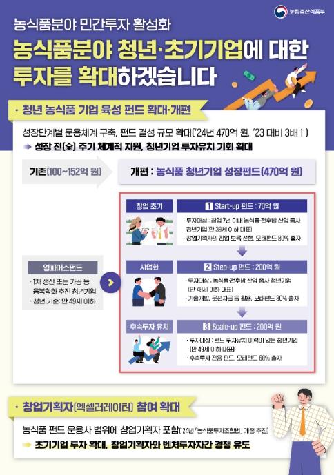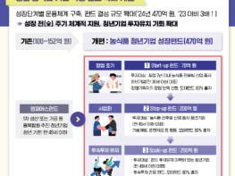 이 자리에서 송 장관은 청년·초기기업을 육성하기 위해 관련 정책 펀드를 확대·체계화할 계획임을 밝혔다. 기존 청년기업 육성을 목적으로 하는 농식품 정책 펀드가 ‘영파머스펀드’로 유일하여 체계적인 지원이 어려운 한계를 극복하기 위해 농식품부는 올해 9월까지 성장단계별 전용 펀드를 신설하고 펀드 규모도 대폭 확대(’23년 152억원 → ’24년 470)하는 등 청년기업의 성장 전(全)주기를 아우르는 정책 펀드 운용체계를 구축한다.