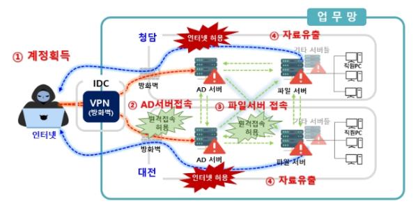 이에 해커는 탈취한 서버 관리자 계정으로 가상사설망을 통해 파일서버에 접근하고 파일서버에서 외부로 파일을 유출할 수 있었다.
