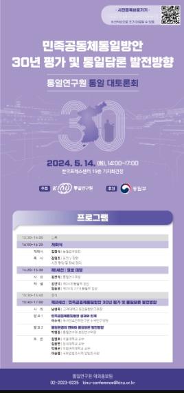[한국쇼핑몰뉴스, 최영진기자] 통일연구원이 주최하고 통일부가 후원하는 ?민족공동체통일방안 30년 평가 및 통일담론 발전방향? 토론회가 5월 14일 14:00~17:00 한국프레스센터 기자회견장(19층)에서 개최된다고 밝혔다.
