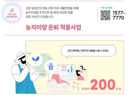 [한국쇼핑몰뉴스, 최영진기자] 고령 농업인의 영농 은퇴 이후 생활안정을 위해 농지이양을 조건으로 월 최대 200만 원을 최장 10년간 지급합니다.