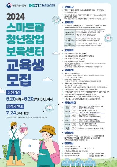 [한국쇼핑몰뉴스, 최영진기자] 농림축산식품부는 5월 13일부터 스마트팜 전문인력 양성을 위해 청년을 대상으로 운영 중인 '스마트팜 청년창업 보육센터'의 2024년 신규 교육생을 모집한다.