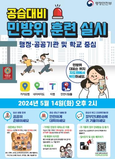 [한국쇼핑몰뉴스, 최영진기자] 행정안전부는 공습 대비 역량을 강화하기 위해 오는 5월 14일(화) 오후 2시부터 행정기관, 공공기관 및 학교를 중심으로 민방위 대피 훈련을 실시한다고 밝혔다.