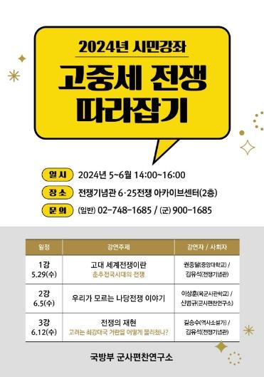 이어서 6월 5일에는 이상훈 육군사관학교 교수가 ’우리가 모르는 나당전쟁 이야기‘라는 주제로, 6월 12일에는 KBS드라마 ’고려거란전쟁‘의 원작자인 길승수 역사소설가가 ’전쟁의 재현‘이라는 제목으로 강연할 예정이다.
