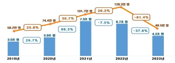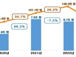 ’22년과 비교하면 납세인원은 128.3만 명에서 78.8만 명이 줄어 61.4%가 감소했고, 결정세액은 6.7조 원에서 2.5조 원이 줄어 37.6%가 감소했다.