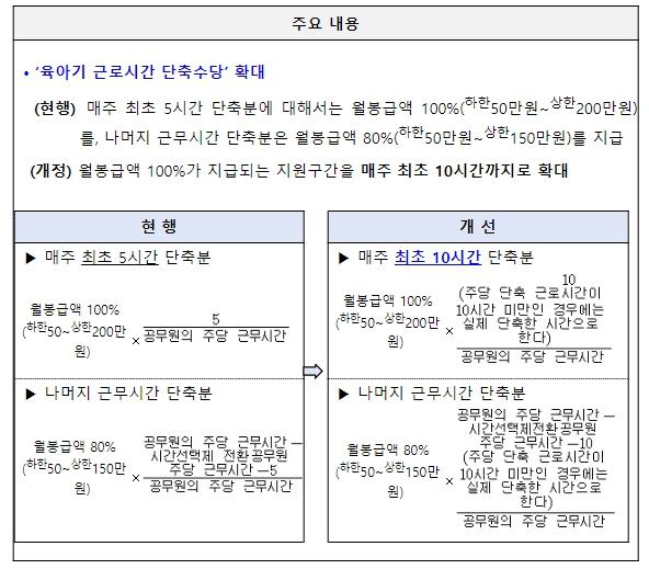 육아를 위해 근로시간을 단축한 공무원의 소득보전을 위해 지급하는 육아기 근로시간 단축수당의 봉급 100% 지원구간을 주당 최초 5시간에서 최초 10시간으로 확대한다.