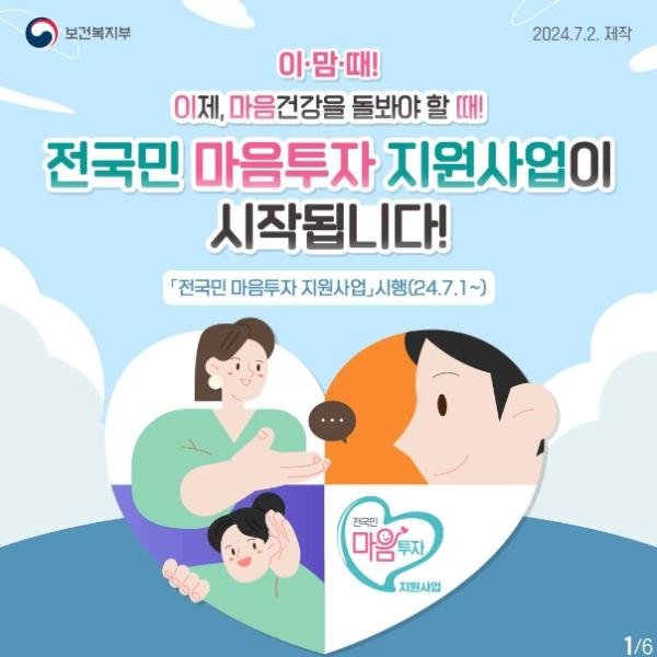 ‘이’제, ‘마음’ 건강을 돌봐야 할 ‘때’ 우울·불안 등 정서적 어려움이 있는 국민에게 전문적인 심리상담 서비스를 제공하는 '전국민 마음투자 지원사업'이 2024년 7월 1일부터 시작됩니다!
