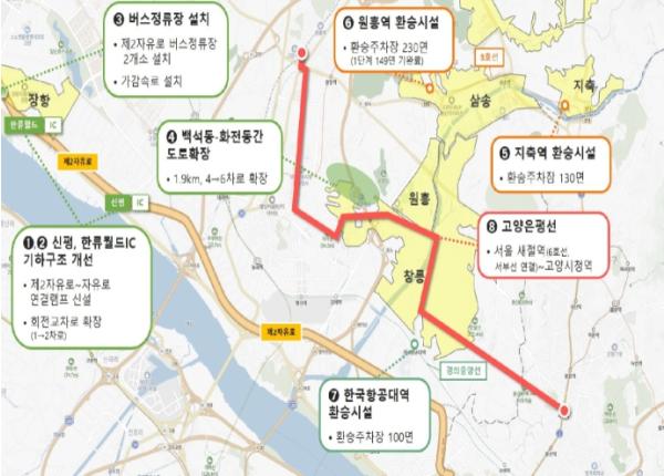 대광위는 고양시 및 LH 등 신도시 사업시행자와 함께 2월 27일 “신도시 광역교통개선 TF(이하 ‘TF’)”를 발족하여 5개월간 광역교통 사업과 관련된 갈등 조정·해소, 인허가 기간 단축 및 재원 집중투자 방안 등을 검토·협의했다. 고양시 9개 집중투자사업의 완공시기를 최대 12개월 단축할 수 있는 방안을 도출했다.