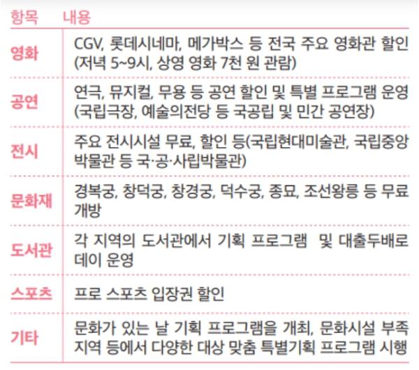 [한국쇼핑몰뉴스, 최영진기자] 전국 주요 문화시설 무료 및 할인 서비스가 문화가 있는 날(매달 마지막 수요일)에 제공됩니다.
