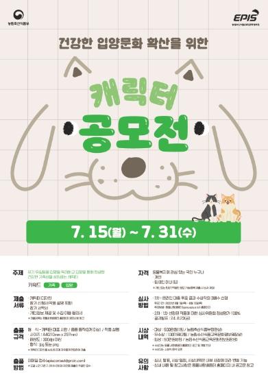 [한국쇼핑몰뉴스, 최영진기자] 농림축산식품부는 유기·유실 동물에 대한 인식개선 및 입양 활성화를 위한 ‘캐릭터 공모전’을 7월 31일까지 개최한다.
