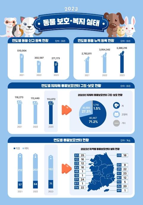 2023년 개·고양이 신규등록은 지난해(30만 3천 마리)보다 10.4% 감소한 27만 1천 마리이나, 누적 등록 개체수는 지난해(305만 4천 마리)보다 7.6% 증가한 328만 6천 마리가 됐다.
