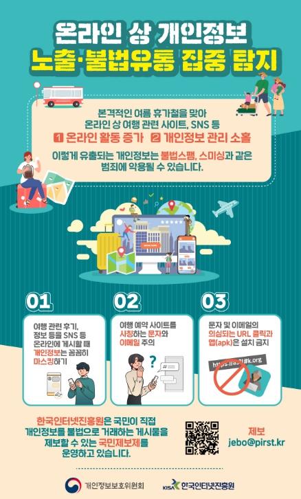 [한국쇼핑몰뉴스, 최영진기자] 개인정보보호위원회는 한국인터넷진흥원과 함께 본격 여름 휴가철을 맞은 7월 29일부터 8월 31일까지 온라인상 개인정보 노출·불법유통 집중 탐지 기간을 운영한다고 밝혔다.
