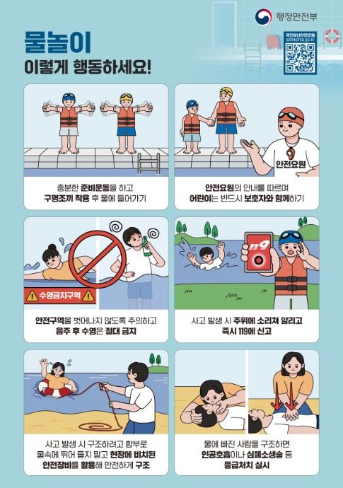 박명균 예방정책국장은 “정부는 어린이들이 안전한 환경에서 물놀이를 즐길 수 있도록 안전관리에 최선을 다하겠다”라며, “어린이와 보호자들께서도 물놀이 안전 수칙을 잘 지켜 즐겁고 건강한 여름을 보내시기를 바란다”라고 말했다.