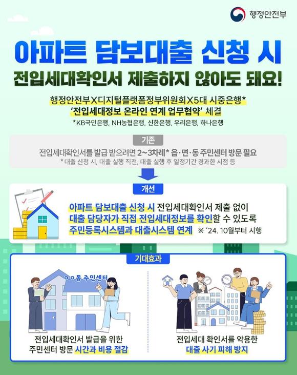 [한국쇼핑몰뉴스, 최영진기자] 아파트 담보대출 신청 시 전입세대확인서 제출하지 않아도 돼요!