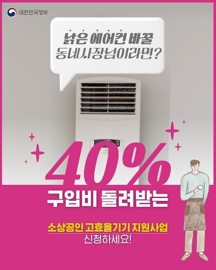 에너지 효율 1등급 에어컨, 냉장고, 세탁기, 건조기, 난방기를 새로 구입하시는 사장님들, 구매 비용의 40% 를 환급해 드려요!
