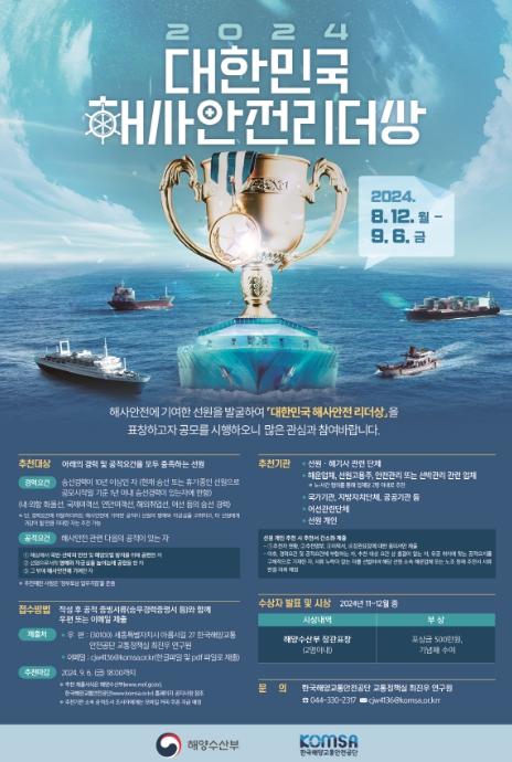 [한국쇼핑몰뉴스, 최영진기자] 해양수산부는 “2024년 대한민국 해사안전 리더상” 선정을 위해 8월 12일부터 9월 6일까지 후보자를 공모한다고 밝혔다.
