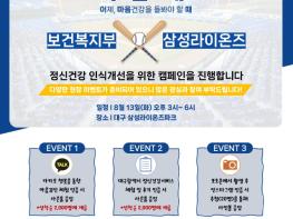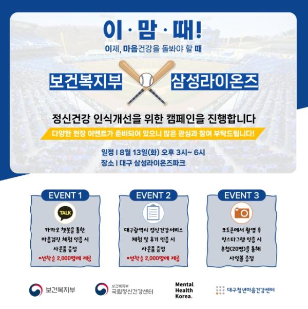 [한국쇼핑몰뉴스, 최영진기자] 보건복지부·국립정신건강센터는 8월 13일 대구 삼성라이온즈파크에서 프로야구단 삼성라이온즈와 멘탈헬스코리아가 주최하는 정신건강 인식개선 캠페인 '이?맘?때! DAY'를 진행한다.