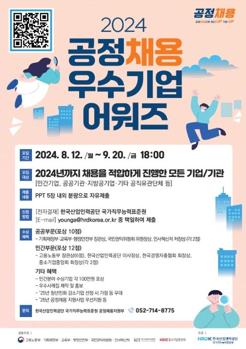[한국쇼핑몰뉴스, 최영진기자] 고용노동부와 한국산업인력공단은 “공정채용 우수기업 어워즈(구 ‘공정채용 우수사례 경진대회’)”를 개최하여 8월 12일부터 9월 20일까지 기업과 공공기관의 선도적인 채용 사례를 모집한다고 밝혔다.