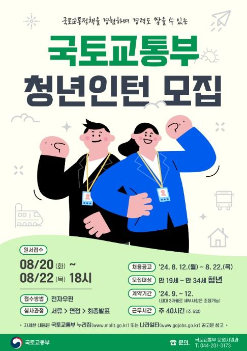 국토교통부 업무에 관심있는 만 19세~34세면 누구나 지원 가능하며, 응시원서 제출(기한 8월 20일~8월 22일) 후 서류전형과 면접심사를 거쳐 9월 24일 최종합격자를 발표할 예정으로 실제 근무는 9월 말부터 시작된다.