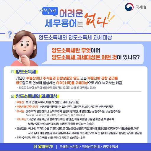 개인이 부동산이나 주식등과 파생상품의 양도 또는 부동산에 관한 권리를 양도함으로 인하여 발생하는 이익(소득)을 과세대상으로 하여 부과하는 세금
