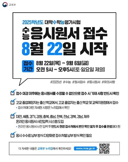 [한국쇼핑몰뉴스, 최영진기자] 2025학년도 수능 응시원서 접수 8월 22일 시작!
