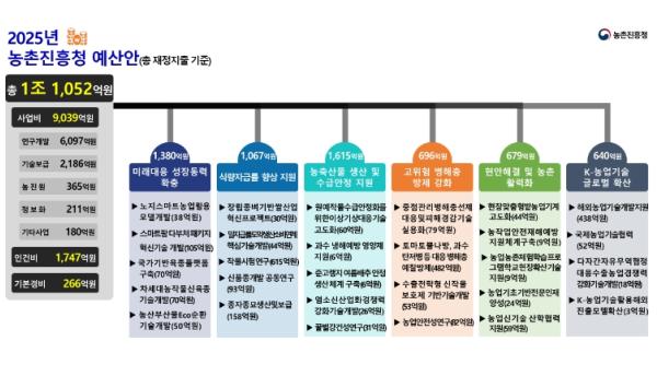 농진청은 미래대응 성장동력 확충, 식량 자급률 향상, 농축산물 생산 및 수급안정, 농업·농촌 활력화 등 핵심과제 성과 창출을 위한 분야에 2025년 예산을 중점 투자할 계획으로 세부 내용은 농업을 미래성장 산업으로 육성하기 위한 스마트농업 확산, 디지털 육종모델 개발 및 푸드테크 산업화 지원에 1,380억원을 투자한다.