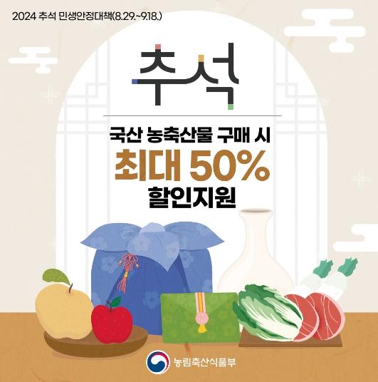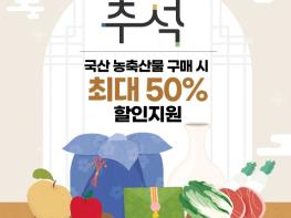 [한국쇼핑몰뉴스, 최영진기자] 추석에 국산 농·축산물 구매 시 최대 50% 할인 지원합니다.