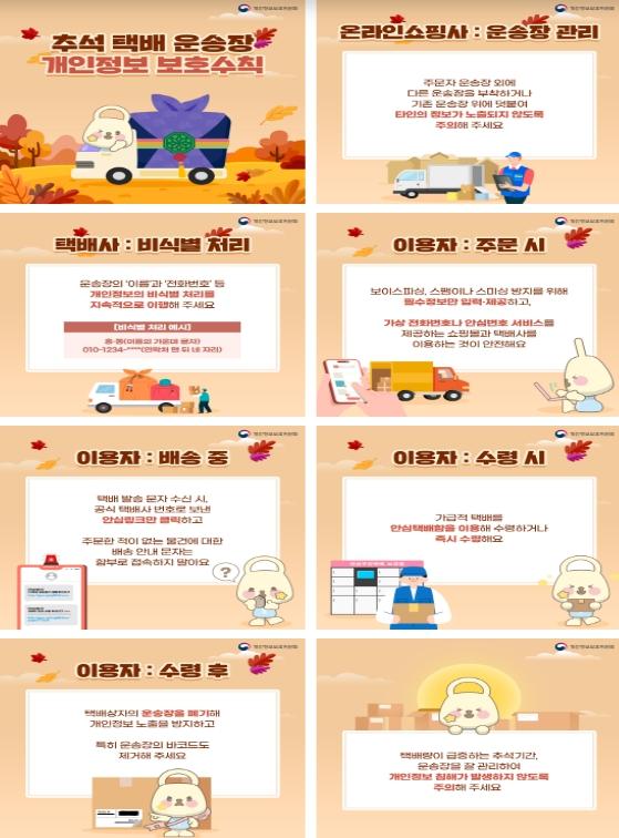 최근 추석을 맞이하여 택배 운송장 관리 소홀로 발생할 수 있는 개인정보 침해사례를 온라인쇼핑·택배사와 함께 공유하고, 이와 같은 개인정보 침해 사례가 재발하지 않도록 주의를 당부했다.