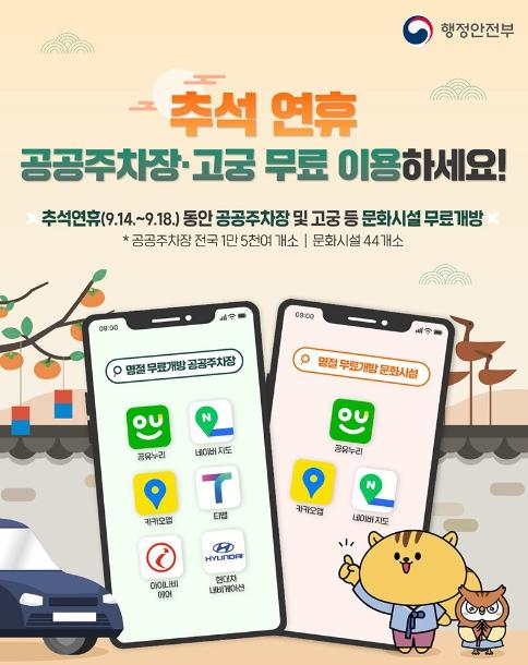[한국쇼핑몰뉴스, 최영진기자] 추석연휴 동안 공공주차장 및 고궁 등 문화시설 무료개방