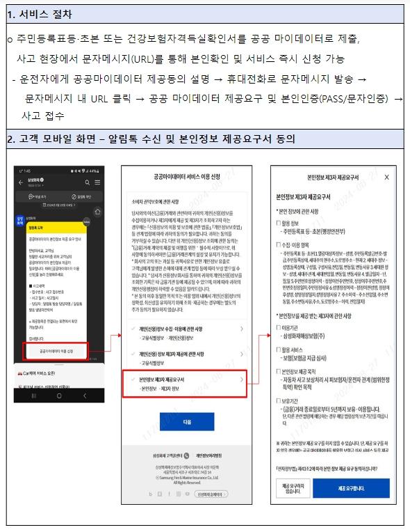 앞으로는 자동차 사고가 발생하면 별도로 서류를 제출할 필요 없이 모바일 ‘본인인증’과 ‘공공 마이데이터 본인정보 제공 요구’에 동의하면 서류 제출이 어려운 사고 현장에서도 쉽게 보험 청구와 사고 처리가 가능해진다.